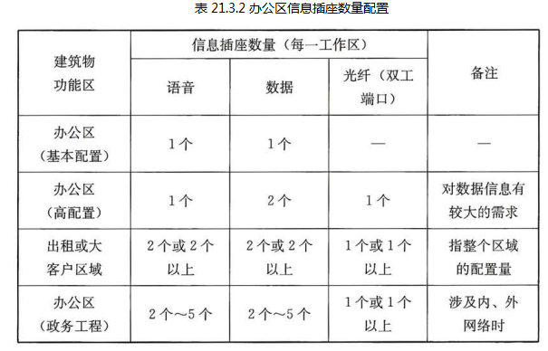 21.3.2 每个工作区信息插座配置数量应根据用户的性质、网络构成和实际需求,确定冗余和发展裕量,办公区信息插座数量不明确时,配置宜符合表 21.3.2