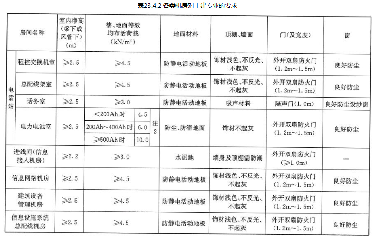 各类机房的室内净高、荷载及地面、门窗等要求,应符合表23.4.2的规定;
