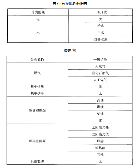 表79中的可再生能源分类能耗数据主要是反映建筑物所利用可再生能源的总量。太阳能光热为总耗热量;太阳能光伏为总发电量;风能为风力总发电量;地热能为总耗热量。