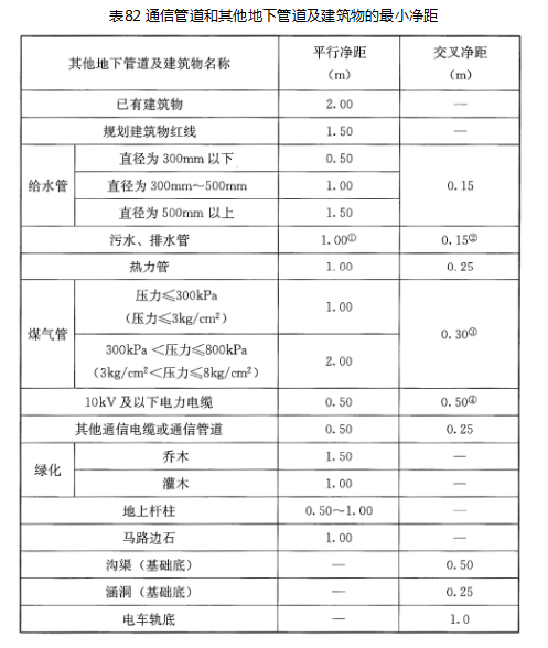 地下通信管道与其他设施地下管线及建筑物间的最小净距应符合表82的规定,并符合现行国家标准《通信管道与通道工程设计标准》GB
