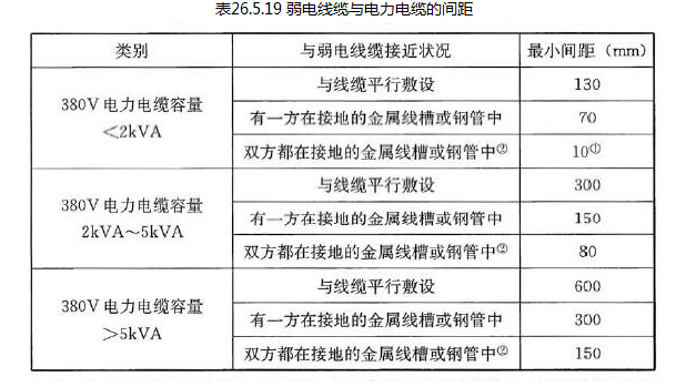 弱电配线管网与附近可能产生高电平电磁干扰的电动机、电力变压器、射频应用设备等电器设备之间应保持必要的间距。弱电线缆与电力电缆的间距应符合表26.5.19的规定。