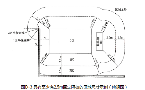 当游泳池设有跳台、跳板、起跳台、坡道或其他预计有人的部位时,1区包括:距跳台、跳板、起跳台、坡道或其他部分周围1.5m的垂直平面;高出预计有人的最高表面2.5m的水平面。