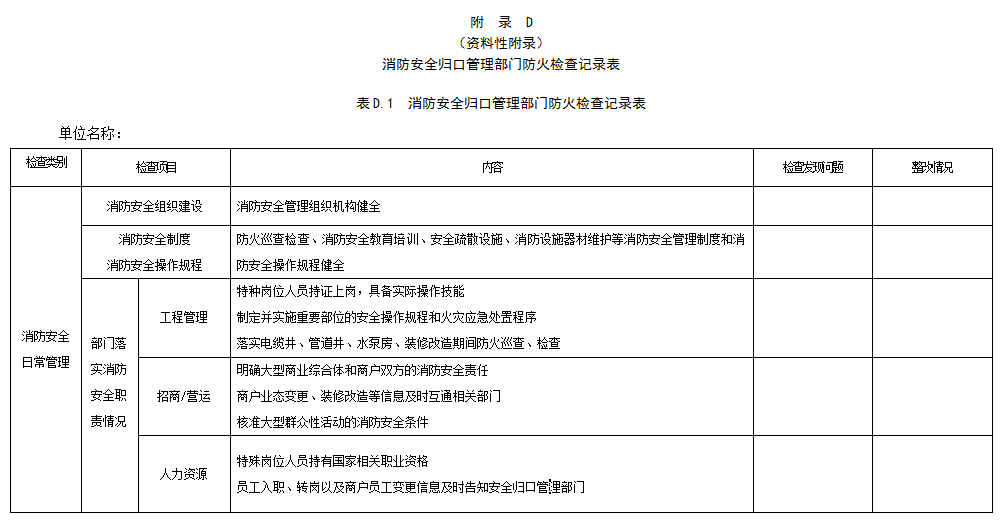 附录D (资料性附录)消防安全归口管理部门防火检查记录表