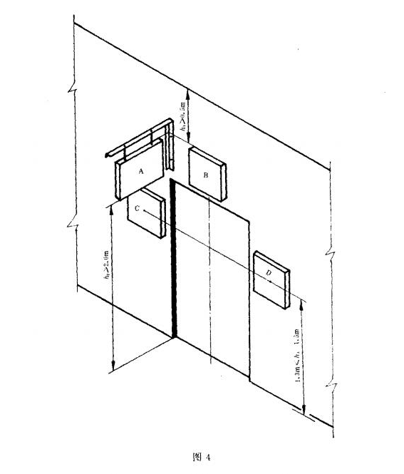 疏散通道出口处,“紧急出口”标志应设置在门框边缘或门的上部,如图4所示A或B的位置。标志牌的上边缘距天花板高h1不应小于0.5