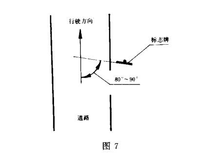 设置在道路边缘的标志牌,在装设时,标志牌所在平面应与行驶方向垂直或成80°~90°角,如图7所示。