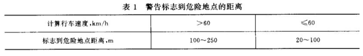 设置在道路边缘的警告标志到危险地点的距离,根据道路的计算行车速度,按表1选取。