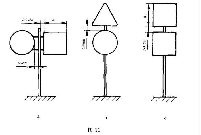 两个或多个三角形(圆形)标志牌或三角形、圆形、正方形标志牌共同设置在同一标志杆时,各标志牌之间的间隙不应小于5 cm,如图11b所示。