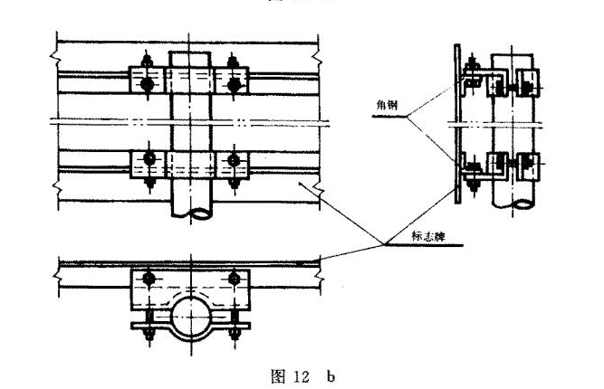 柱式设置的消防安全标志牌应用螺栓、管箍等牢固地固定在标志杆上。固定方法可参照图12进行。