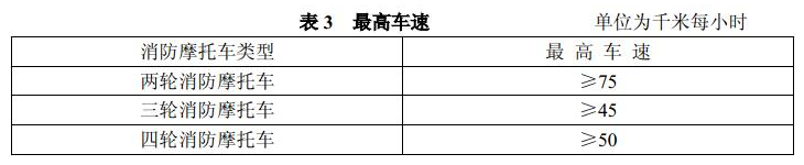 消防摩托车最高车速的测定应按6.1.3进行,最高车速应符合表3的规定。