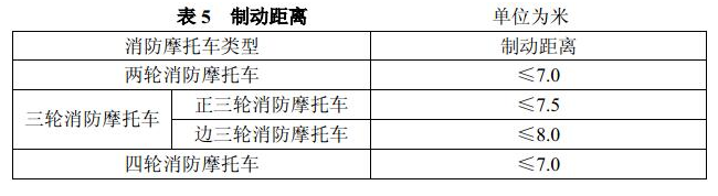 消防摩托车制动距离的测定应按6.1.5进行,制动距离应符合表5的规定。