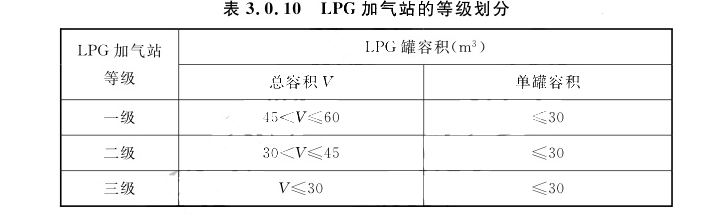 注:V为油罐总容积。柴油罐容积可折半计入油罐总容积。3.0.10 LPG加气站的等级划分应符合表3.0.10的规定。
