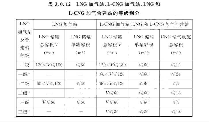 注:带“*”的加气站专指CNG常规加气站以LNG储罐作补充气源的建站形式。3.0.13 LNG加气站与CNG常规加气站或CNG加气子站的合建站的等级划分,应符合表3.0.13的规定。