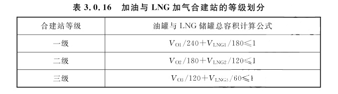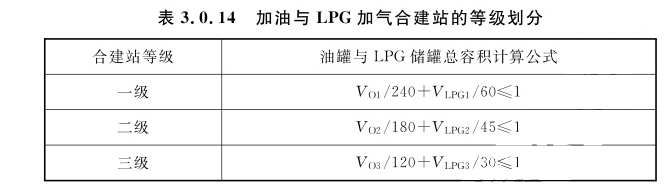 注:1 V为LNG储罐总容积。 2 括号内数字为CNG储气井和CNG加气子站的储气设施总容积。3.0.14 加油与LPG加气合建站的等级划分,应符合表3.0.14的规定。