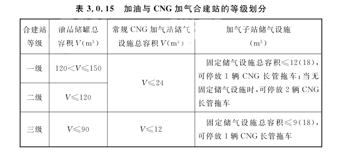 注:1 VO1、VO2、VO3分别为一、二、三级合建站中油品储罐总容积(m³);VLPG1、VLPG2、VLPG3分别为一、二、三级合建站中LPG储罐总容积(m³)。“/”为除号。 2 柴油罐容积可折半计入油罐总容积。 3 当油罐总容积大于90m³时,油罐单罐容积不应大于50m³;当油罐总容积小于或等于90m³时,汽油罐单罐容积不应大于30m³,柴油罐单罐容积不应大于50m³。 4 LPG储罐单罐容积不应天于30m³。3.0.15 加油与CNG加汽合建站的等级划分应符合表3.0.15的规定。