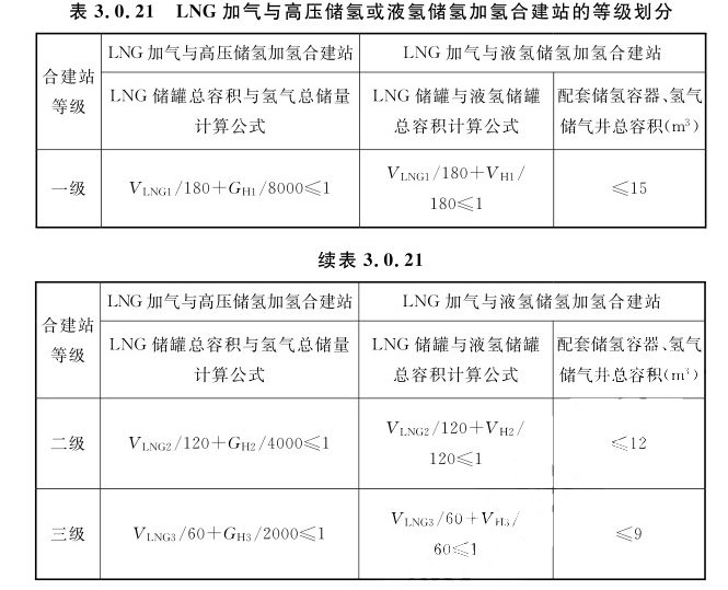 注:1 表中括号内数字为CNG储气设施采用储气井的总容积。 2 储氢总量包含作为站内储氢容器使用的氢气长管拖车或管束式集装箱储氢量。 3 氢气储量计算基于20℃温度和储氢容器的额定工作压力。 4 V为液氢储罐总容积。3.0.21 LNG加气与高压储氢或液氢储氢加氢合建站的等级划分,应符合表3.0.21的规定。
