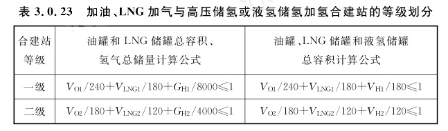 2 表中LNG加气站包括L-CNG加气站、LNG/L-CNG加气站,LNG储罐和液氢储罐单罐容积应小于或等于60m³。 3 储氢总量包含作为站内储氢容器使用的氢气长管拖车或管束式集装箱储氢量。3.0.22 加油、CNG加气与高压储氢或液氢储氢加氢合建站的等级划分,应符合表3.0.22的规定。