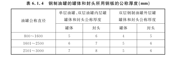 6.1.1 除橇装式加油装置所配置的防火防爆油罐外,加油站的汽油罐和柴油罐应埋地设置,严禁设在室内或地下室内。6.1.2 汽车加油站的储油罐应采用卧式油罐。6.1.3 埋地油罐需要采用双层油罐时,可采用双层钢制油罐、双层玻璃纤维增强塑料油罐、内钢外玻璃纤维增强塑料双层油罐。既有加油站的埋地单层钢制油罐改造为双层油罐时,可采用玻璃纤维增强塑料等满足强度和防渗要求的材料进行衬里改造。6.1.4 单层钢制油罐、双层钢制油罐和内钢外玻璃纤维增强塑料双层油罐的内层罐的罐体结构设计,可按现行行业标准《钢制常压储罐 第一部分:储存对水有污染的易燃和不易燃液体的埋地卧式圆筒形单层和双层储罐》AQ3020的有关规定执行,并应符合下列规定: 1 钢制油罐的罐体和封头所用钢板的公称厚度,不应小于表6.1.4的规定。