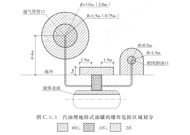 C.0.1 爆炸危险区域的等级定义应符合现行国家标准《爆炸危险环境电力装置设计规范》GB50058的有关规定。C.0.2 汽油、LPG和LNG设施的爆炸危险区域内地坪以下的坑或沟应划为1区。C.0.3 汽油埋地卧式油罐的爆炸危险区域划分(图C.0.3)应符合下列规定: