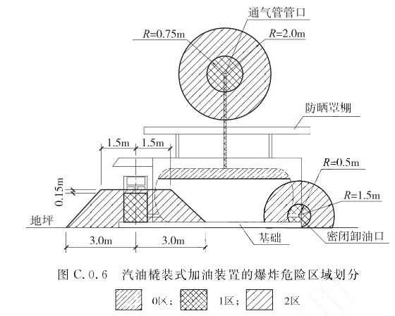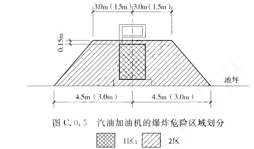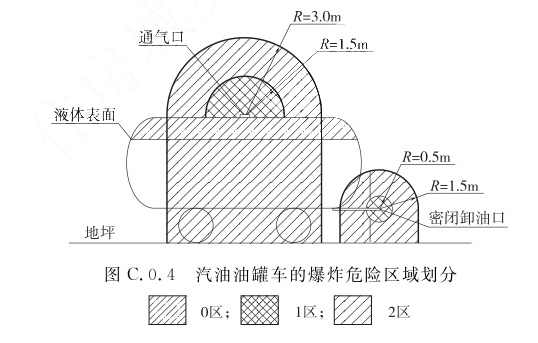 1 油罐车内部的油品表面以上空间应划分为0区; 2 以罐车通气口为中心、半径为1.5m的球形空间和以罐车密闭卸油口为中心、半径为0.5m的球形空间,应划分为1区; 3 以罐车通气口为中心、半径为3.0m的球形并延至地面的空间和以罐车密闭卸油口为中心,半径为1.5m的球形并延至地面的空间,应划分为2区。C.0.5 汽油加油机的爆炸危险区域划分(图C.0.5)应符合下列规定:
