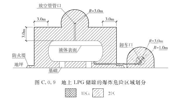 1 人孔(阀)井内部空间和以卸车口为中心、半径为1.0m的球形空间,应划分为1区; 2 距人孔(阀)井外边缘3.0m以内,自地面算起2.0m高的圆柱形空间,以放空管管口为中心、半径为3.0m的球形并延至地面的空间和以卸车口为中心、半径为3.0m的球形并延至地面的空间,应划分为2区。C.0.9 地上LPG储罐的爆炸危险区域划分(图C.0.9)应符合下列规定: