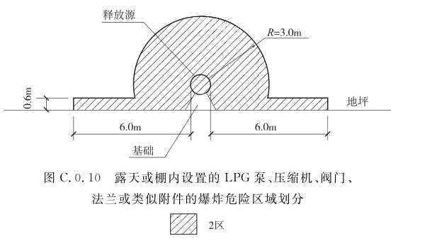 1 以卸车口为中心、半径为1.0m的球形空间,应划分为1区; 2 以放空管管口为中心、半径为3.0m的球形空间,距储罐外壁3.0m范围内并延至地面的空间,防护堤内与防护堤等高的空间和以卸车口为中心、半径为3.0m的球形并延至地面的空间,应划分为2区。C.0.10 露天或棚内设置的LPG泵、压缩机、阀门、法兰或类似附件的爆炸危险区域划分(图C.0.10),距释放源壳体外缘半径为3.0m范围内的空间和距释放源壳体外缘6.0m范围内,自地面算起0.6m高的空间,应划分为2区。