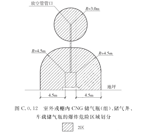 1 压缩机、泵、法兰、阀门或类似附件的房间内部空间,应划分为1区; 2 房间有孔、洞或开式外墙,距孔、洞或墙体开口边缘3.0m范围内与房间等高的空间,应划分为2区; 3 在1区范围之外,距释放源距离为R2,自地面算起0.6m高的空间,应划分为2区。当1区边缘距释放源的距离L大于3.0m时,R2取值应为L外加3.0m;当1区边缘距释放源的距离L小于或等于3.0m时,R2取值应为6.0m。C.0.12 室外或棚内CNG储气瓶(组)、储气井、车载储气瓶的爆炸危险区域划分(图C.0.12),以放空管管口为中心、半径为3.0m的球形空间和距储气瓶(组)壳体(储气井)4.5m以内并延至地面的空间,应划分为2区。