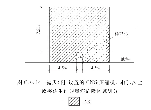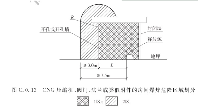1 压缩机、阀门、法兰或类似附件的房间的内部空间,应划分为1区; 2 房间有孔、洞或开式外墙,距孔、洞或墙体开口边缘为R的范围并延至地面的空间,应划分为2区。当1区边缘距释放源的距离L大于或等于4.5m时,R应取值为3.0m;当1区边缘距释放源的距离L小于4.5m时,R应取值为(7.5-L)m。C.0.14 露天(棚)设置的CNG压缩机、阀门、法兰或类似附件的爆炸危险区域划分(图C.0.14),距压缩机、阀门、法兰或类似附件壳体水平方向4.5m以内并延至地面的空间,距压缩机、阀门、法兰或类似附件壳体顶部以上7.5m的空间,应划分为2区。