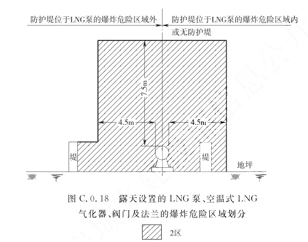 1 距LNG储罐的外壁和顶部3.0m的范围内应划分为2区; 2 储罐区的防护堤至储罐外壁,高度为堤顶高度的范围内应划分为2区。C.0.18 露天设置的LNG泵、空温式LNG气化器、阀门及法兰的爆炸危险区域划分(图C.0.18)应符合下列规定: