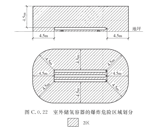 1 加氢机、氢气卸气柱内部全间,应划分为1区; 2 距加氢机、卸气柱外轮廓4.5m,并延至顶部以上4.5m的空间,应划分为2区。C.0.22 室外储氢容器的爆炸危险区域划分(图C.0.22),距设备外缘4.5m,并延至顶部以上4.5m的空间,应划分为2区。