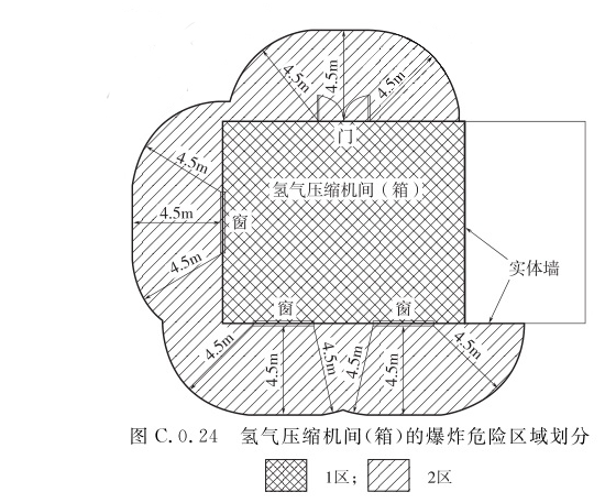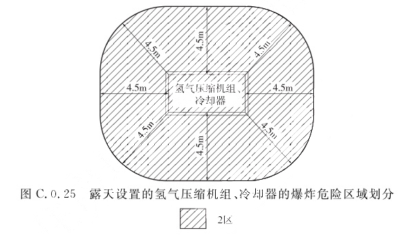 1 房间(箱)内部空间应划分为1区; 2 以房间(箱)的门、窗边沿或孔计算,半径为4.5m,并延至地坪的空间,应划分为2区; 3 与氢气压缩机间相邻的无释放源房间位于爆炸危险区域内时,应用非燃烧体的实体墙隔开。C.0.25 露天设置的氢气压缩机组、冷却器的爆炸危险区域划分(图C.0.25),距氢气压缩机组、冷却器外轮廓4.5m,并延至顶部以上4.5m的空间应划分为2区。