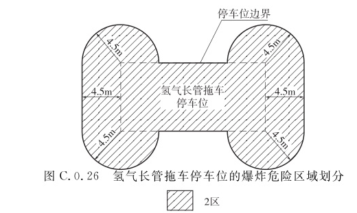 C.0.26 氢气长管拖车停车位的爆炸危险区域划分(图C.0.26),停车位区域和以停车位短边为中心、半径4.5m范围内,并延至氢气长管拖车顶部以上4.5m的空间,应划分为2区。