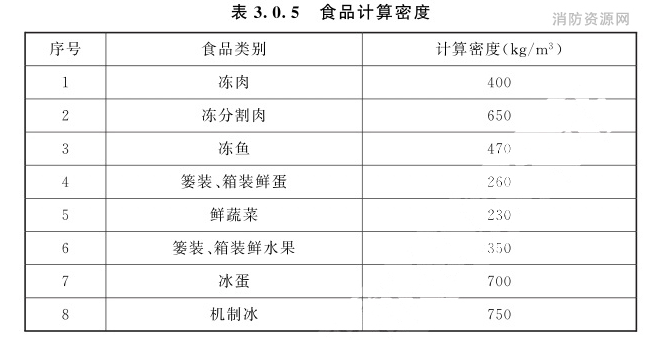 式中:G——冷库的算容量(t); νi——各个冷藏间的公称容积(m³) ηi——各个冷藏间的容积利用系数; ρi——各个冷藏间食品的计算密度(kg/m³); n——冷藏间的数量。3.0.3 在计算冷藏间的容积利用系数时,冷藏间内能够用于堆码的货物体积应扣除相应冷藏间内的以下空间: 1 通道、设备、柱子等构筑物所占用的空间; 2 货物与设备、构筑物间隔所占用的空间; 3 货物托盘所占用的空间。3.0.4 对于采用货架储存冷藏物的冷库计算容量可按每个货位(托盘)最大允许存放量的总和计算。货位(托盘)数量应按实际布置确定。3.0.5 食品计算密度应按实际密度采用,并不应小于表3.0.5的规定。