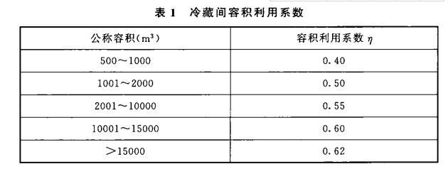3.0.1 本条所述室内净面积为不扣除室内柱、门斗和制冷设备所占面积的净面积。3.0.3 冷藏间的容积利用系数是指每个冷藏间内贮存货物的货物体积与公称容积的比值。当因货物的包装、运输、堆码方式以及经营管理模式等条件不确定,冷藏间的容积利用系数无法进行准确计算时,可参照表1进行取值。表1是原规范针对不同规模的公称容积确定的对应容积利用系数。