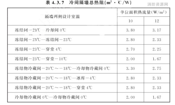 4.3.7 冷间隔墙总热阻可根据镉墙两侧设计室温接表4.3.7的规定选用。