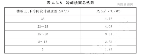 注:隔墙总热阻已考虑生产中的温度波动因素。4.3.8 冷间楼面总热阻可根据楼板上、下冷间设计温度差按表4.3.8的规定选用。