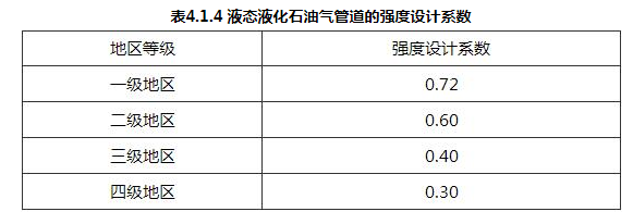 4.1.4 液态液化石油气管道的强度设计系数应符合表4.1.4的规定。