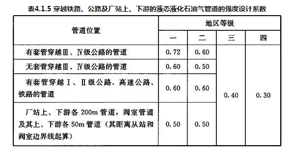 4.1.5 穿越铁路、公路及厂站上、下游的液态液化石油气管道的强度设计系数,应符合表4.1.5的规定。