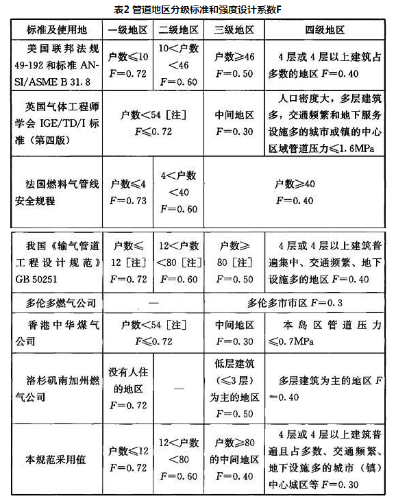管道地区等级的划分方法英国、美国有所不同,但大同小异。美国联邦法规和美国国家标准ANSI/ASME B31.8是按不同的独立建筑(居民户)密度将输气管道沿线划分为四个地区等级,其划分方法是以管道中心线两侧各220码(约200m)范围内,任意划分为1英里(约1.6km)长,并能包括最多供人居住独立建筑(居民户)数量的地段,以此计算出该地段的独立建筑(居民户)密度,据此确定管道地区等级;现行国家标准《输气管道工程设计规范》GB 50251的划分方法与美国法规和ANSI/ASME B31.8标准相同,但分段长度为2km;英国气体工程师学会标准IGE/TD/1是按不同的居民人数密度将输气管道沿线划分为三个地区等级,其划分方法是以管道中心线两侧各4倍管道距建筑物的水平净距(根据压力和管径查图)范围内,任意划分为1英里(约1.6km)长并能包括最多数量居民户的地段,以此计算出该地段每公顷面积上居民户的密度,并据此确定管道地区等级。几个国家和地区管道地区分级标准和强度设计系数F详见表2。