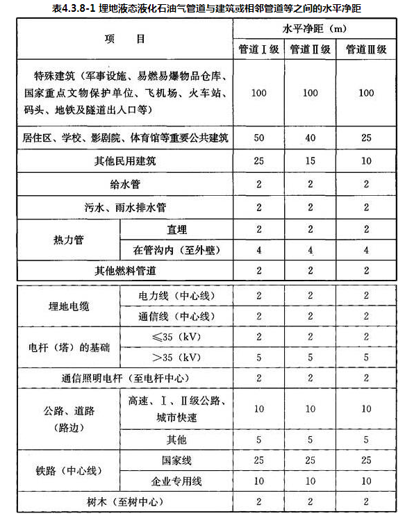 4.3.8 埋地液态液化石油气管道与建筑或相邻管道等之间的水平净距不应小于表4.3.8-1的规定;埋地管道与相邻管道或道路之间的垂直净距不应小于表4.3.8-2的规定。