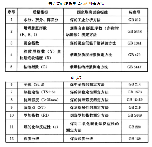装炉煤的各质量指标的测定应按国家煤炭试验标准方法进行(见表7)。