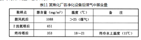5.2.2为了保证煤气净化设备的正常操作和减轻煤气鼓风机的负荷,要求在冷却煤气时尽可能多地把萘、焦油等杂质冷凝下来并从系统中排出。为了达到这一目的就需对初冷器后煤气温度有一定的限制,一般控制在20~25℃为好。如石家庄东风焦化厂因为采取了严格控制初冷器出口温度为(20±2)℃范围之内的措施,进入各净化设备之前煤气中萘含量就很少,保证了净化设备的正常运行,见表11。