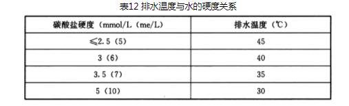 初冷器的冷却水出口温度。为了防止初冷器内水垢生成,又要照顾到对冷却水的暂时硬度不宜要求过分严格(否则导致水的软化处理投资过高),因此需要控制初冷器出口水的温度。排水温度与水的硬度有关。见表12。