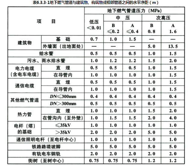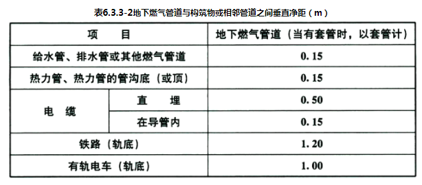 注:如果选用L210级钢管,强度设计系数F'为表中F值乘1.167。6.3.3本条规定了敷设地下燃气管道的净距要求。
