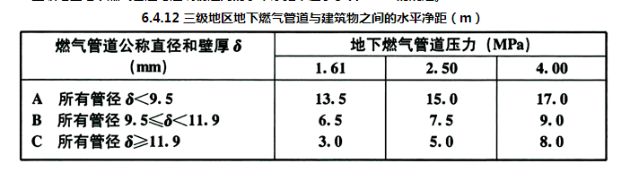 6.4.11、6.4.12 关于地下燃气管道到建筑物的水平净距。