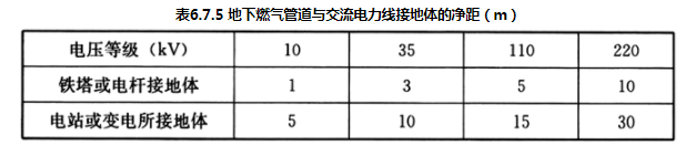 6.7.5 地下燃气管道与交流电力线接地体的净距不应小于表6.7.5的规定。