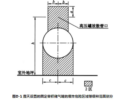 1) 露天设置的固定容积储气罐的爆炸危险区域等级和范围划分见图D-1。