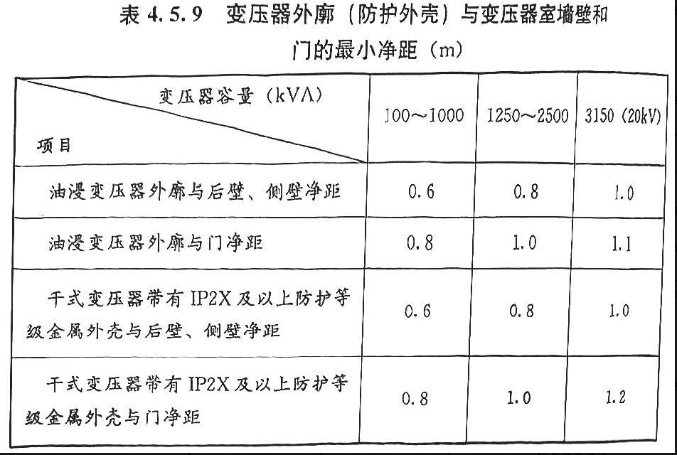1)《民用建筑电气设计标准》GB51348-2019第4.5.9条:变压器外廓(防护外壳)与变压器室墙壁和门的净距不应小于表4.5.9的规定。