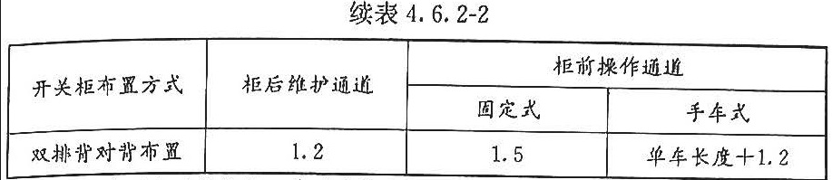 注:1 采用柜后免维护可靠墙安装的开关柜靠墙布望时,柜后与墙净距应大于50mm,侧面与墙净距应大于200mm; 2 通道宽度在建筑物的墙面遇有柱类局部凸出时,凸出部位的通道宽度可减少200mm。