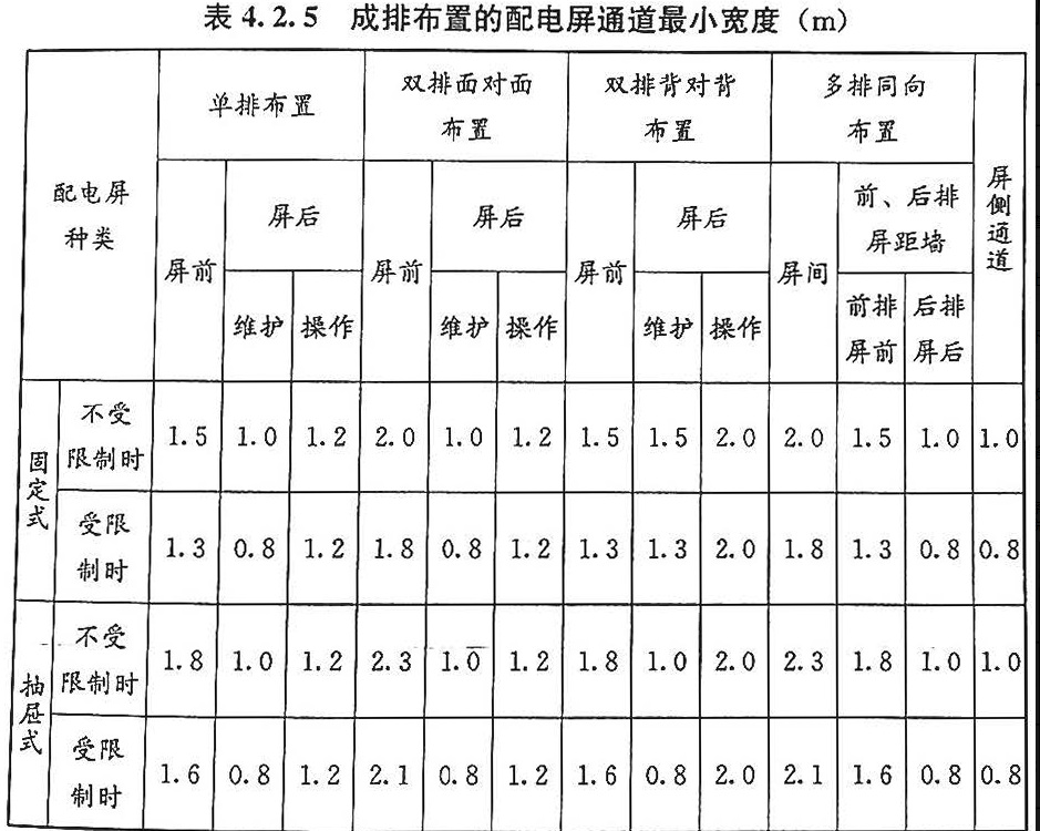 3)《低压配电设计规范》GB50054-2011第4.2.5条:当防护等级不低于现行国家标准《外壳防护等级(IP代码)》GB4208规定的IP2X级时,成排布置的配电屏通道最小宽度应符合表4.2.5的规定。
