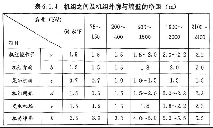 1 柴油发电机房内,机组之间、机组外廊至墙的距离应满足设备运输、就地操作、维护维修及布置辅助设备的需要;